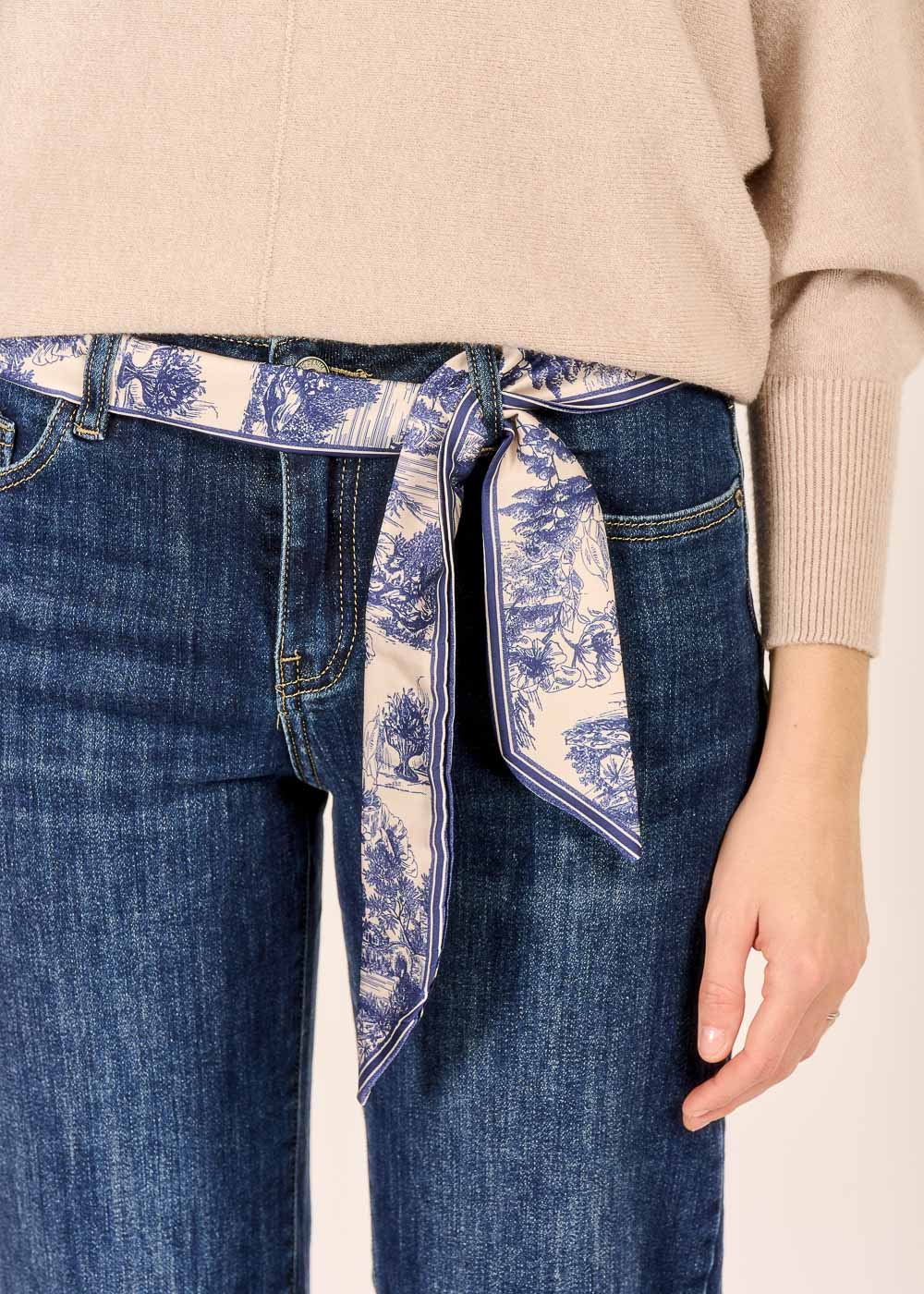 Dunkles Denim steht für klassische Eleganz und wird durch ein Tuch als Gürtel zum modernen Blickfang. Das Detail setzt einen stilvollen Akzent und verleiht deinem Look eine persönliche Note. Eine Jeans für alle, die das Besondere im Alltag schätzen.