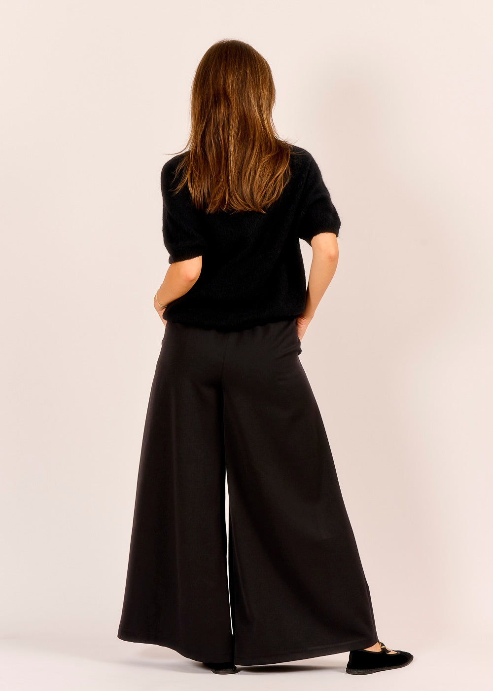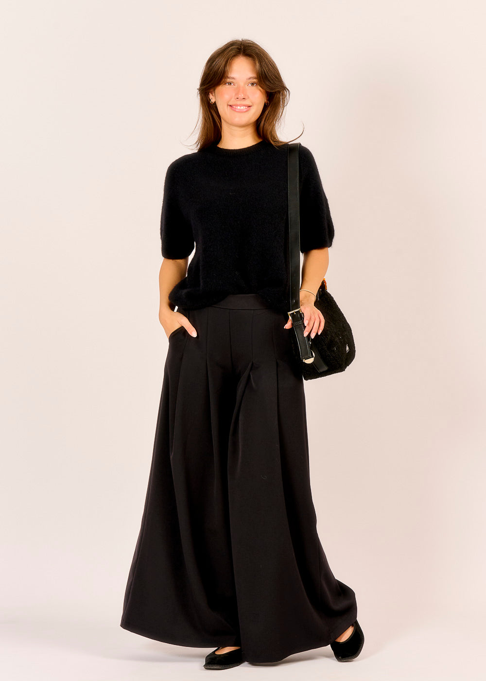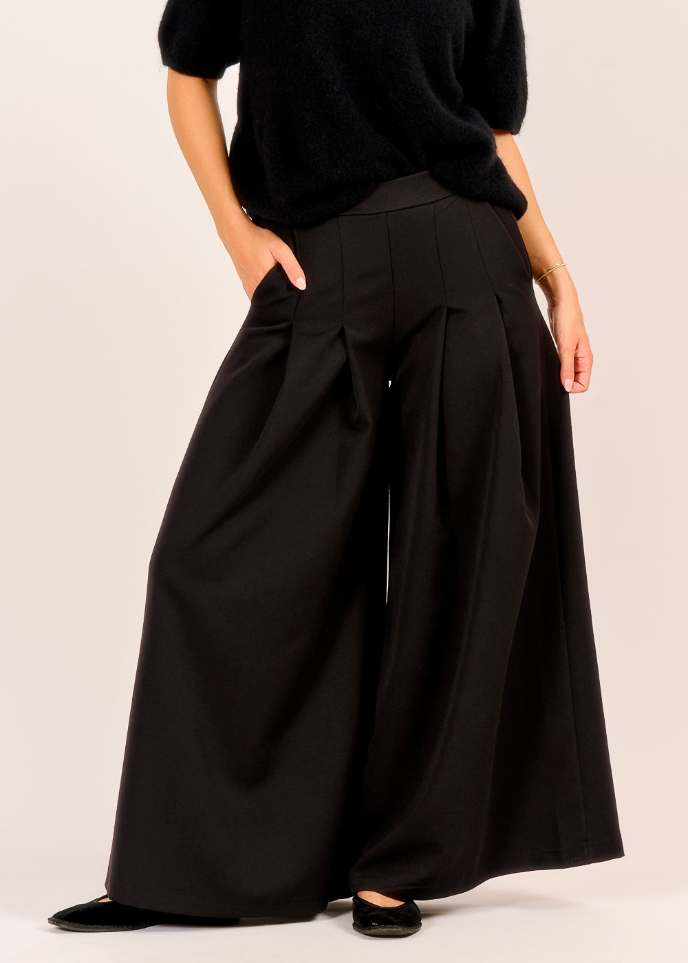 Diese schwarze Hose mit Bundfalten ist schlicht im Ton, aber stark im Ausdruck. Die Bundfalten verleihen ihr jenen Hauch von Raffinesse, der aus einem Kleidungsstück einen echten Blickfang macht. Ob du sie im Alltag trägst, im Office oder zu besonderen Momenten – jedes Outfit wirkt wie selbstverständlich durchdacht.