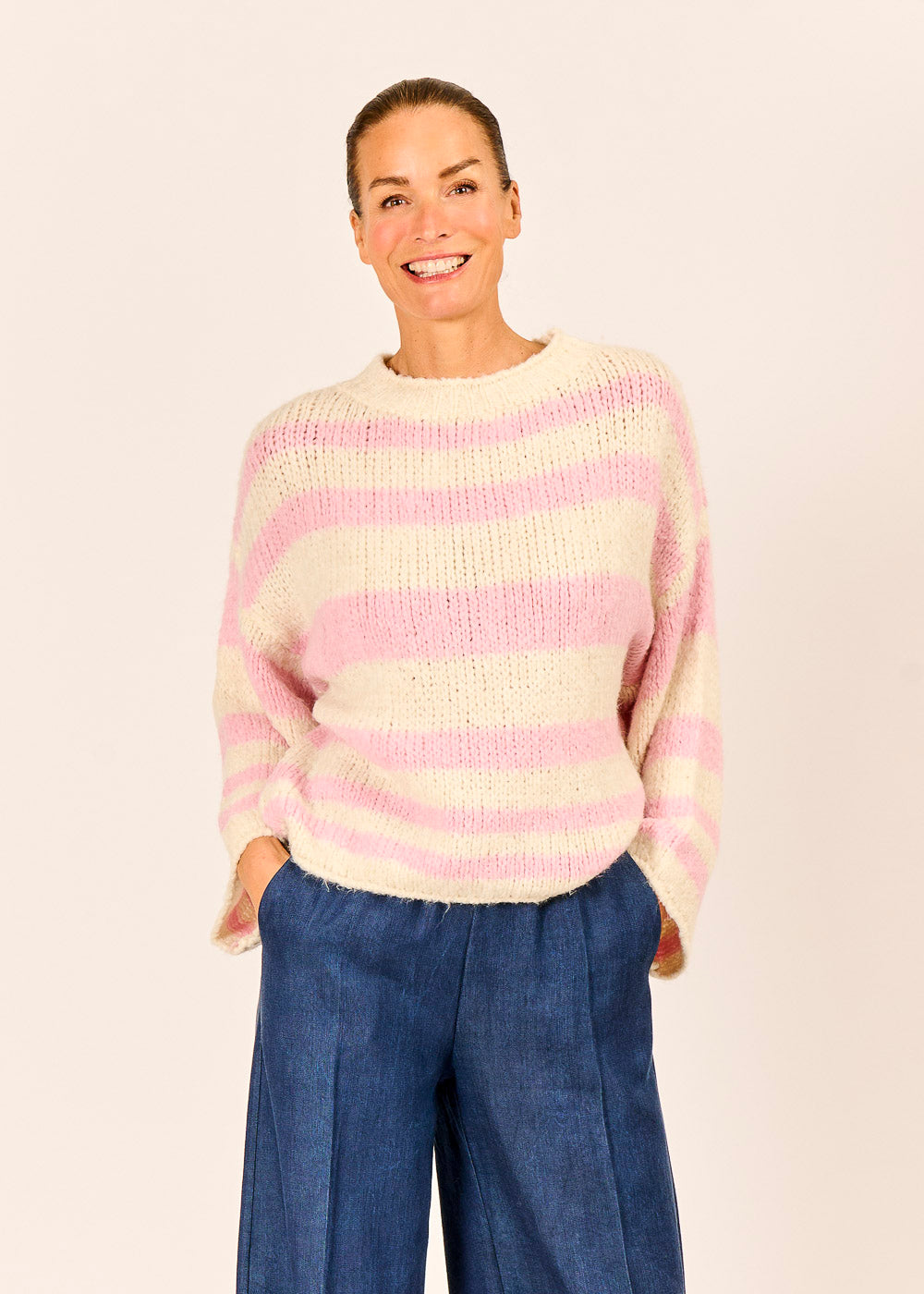 Dieser kuschelige Streifenpullover ist ein charmantes Statement-Piece, das mit einer harmonischen Farbkombination aus hellem Beige (oder Creme) und zartem Rosa besticht. Der grobe Strick und der lockere Schnitt sorgen für ein wunderbar weiches und komfortables Tragegefühl. Ein perfektes Basic, das lässige Denim-Looks sofort mit einem Hauch von Frische und Verspieltheit belebt.