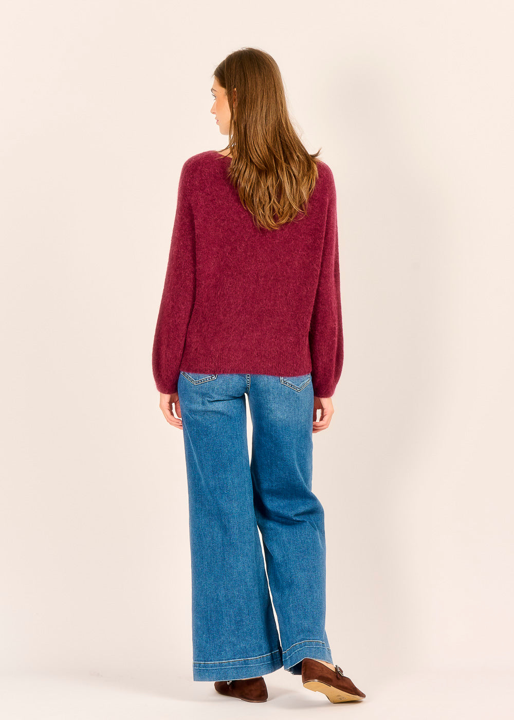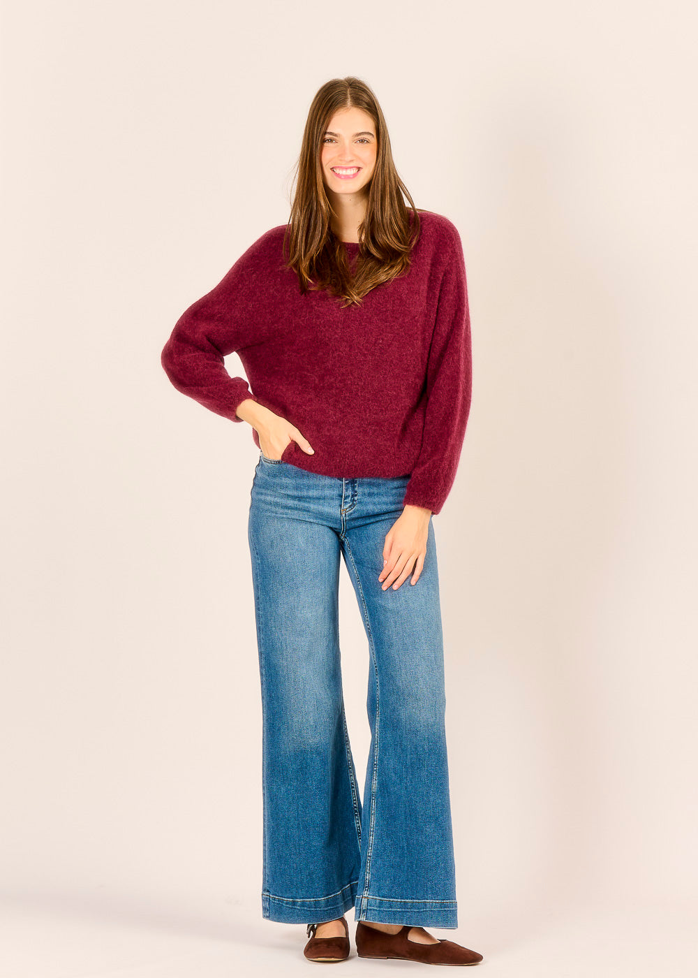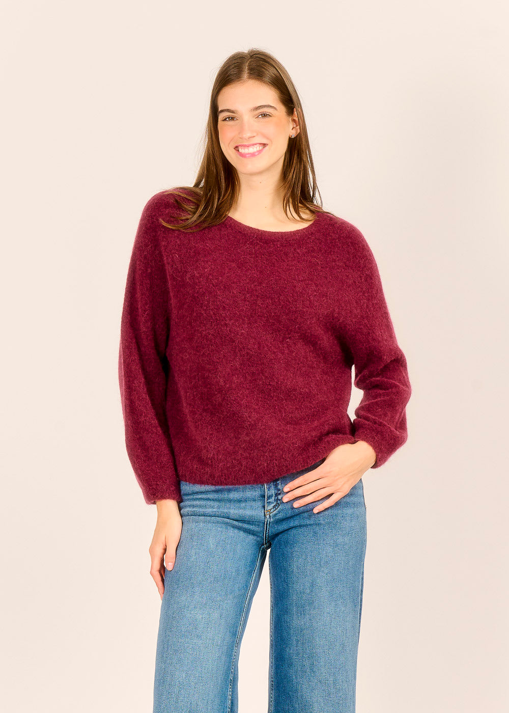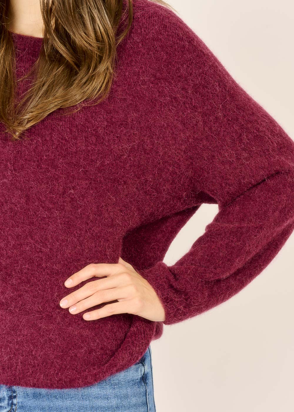Lassen Sie sich von diesem kuscheligen Pullover in der tiefen, eleganten Trendfarbe Vino (Bordeaux) in den Bann ziehen. Er ist der ultimative "Wohlfühlpullover", dessen weiches Material und lockerer Schnitt sofortige Behaglichkeit versprechen. Ob zur lässigen Jeans oder über einem Rock – dieses luxuriöse Basic verleiht Ihrem Alltags-Look einen Hauch von stilvoller Tiefe und Wärme.