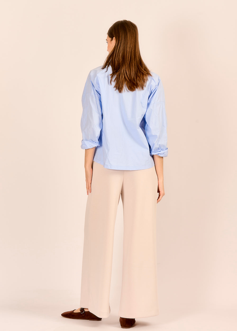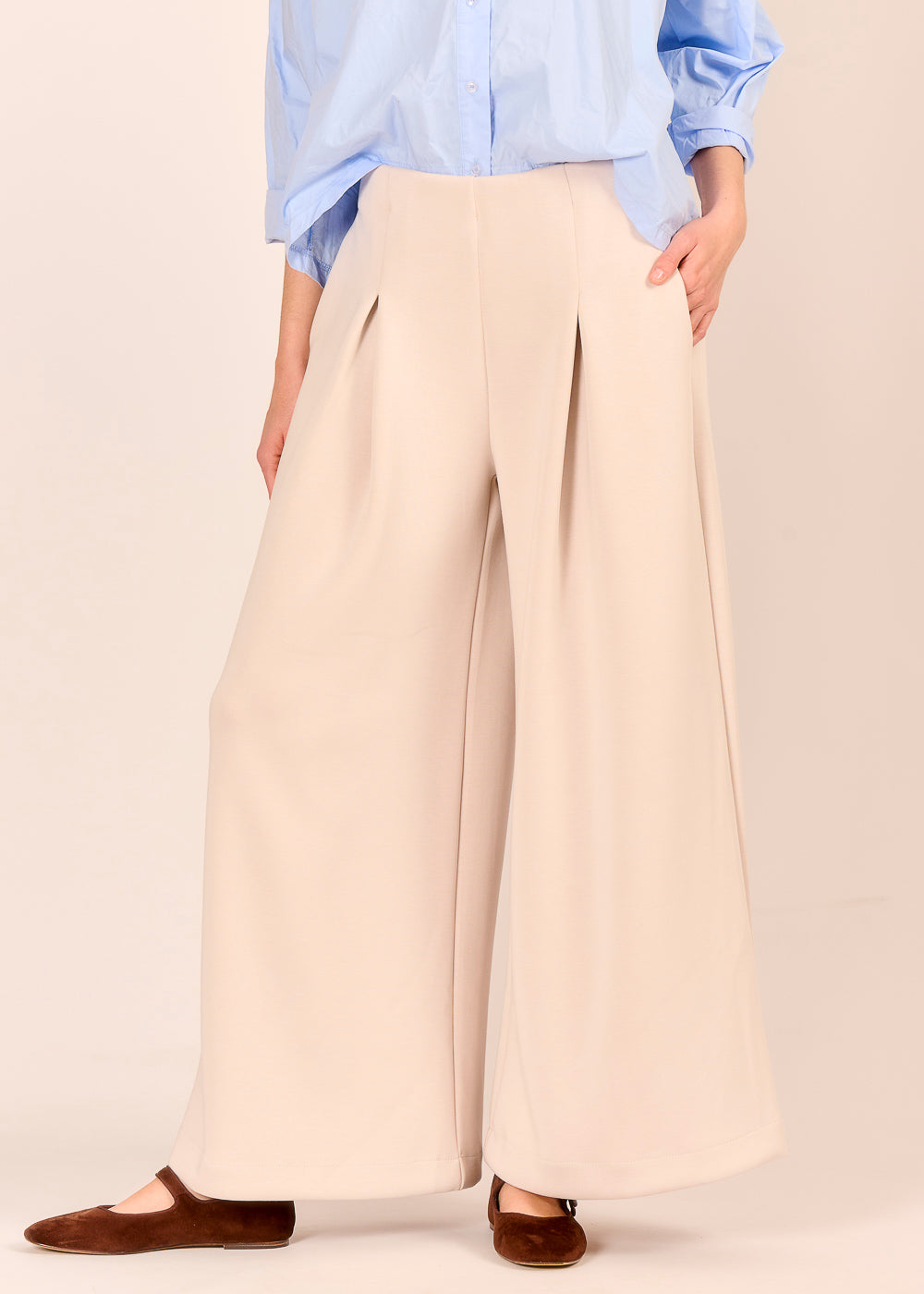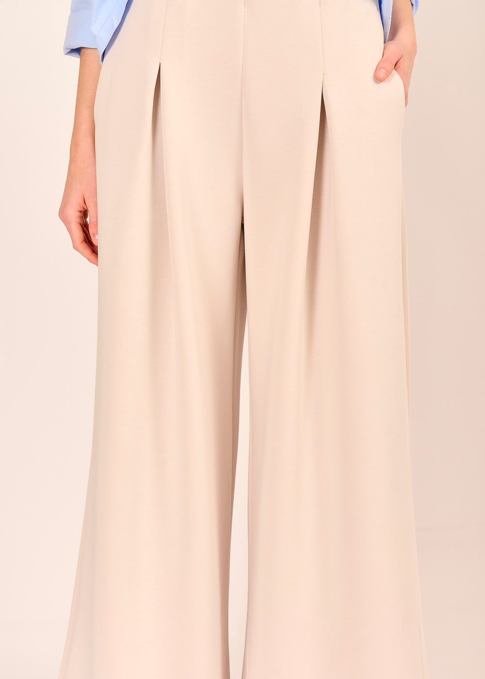 Die modische Hose in elegantem Beige vereint Komfort und italienische Raffinesse. Der fließende Stoff aus Viskose und Modal sorgt für ein bequemes Tragegefühl. Die weite, feminine Silhouette mit den drapierten Falten zaubert mühelos einen stilbewussten Look.