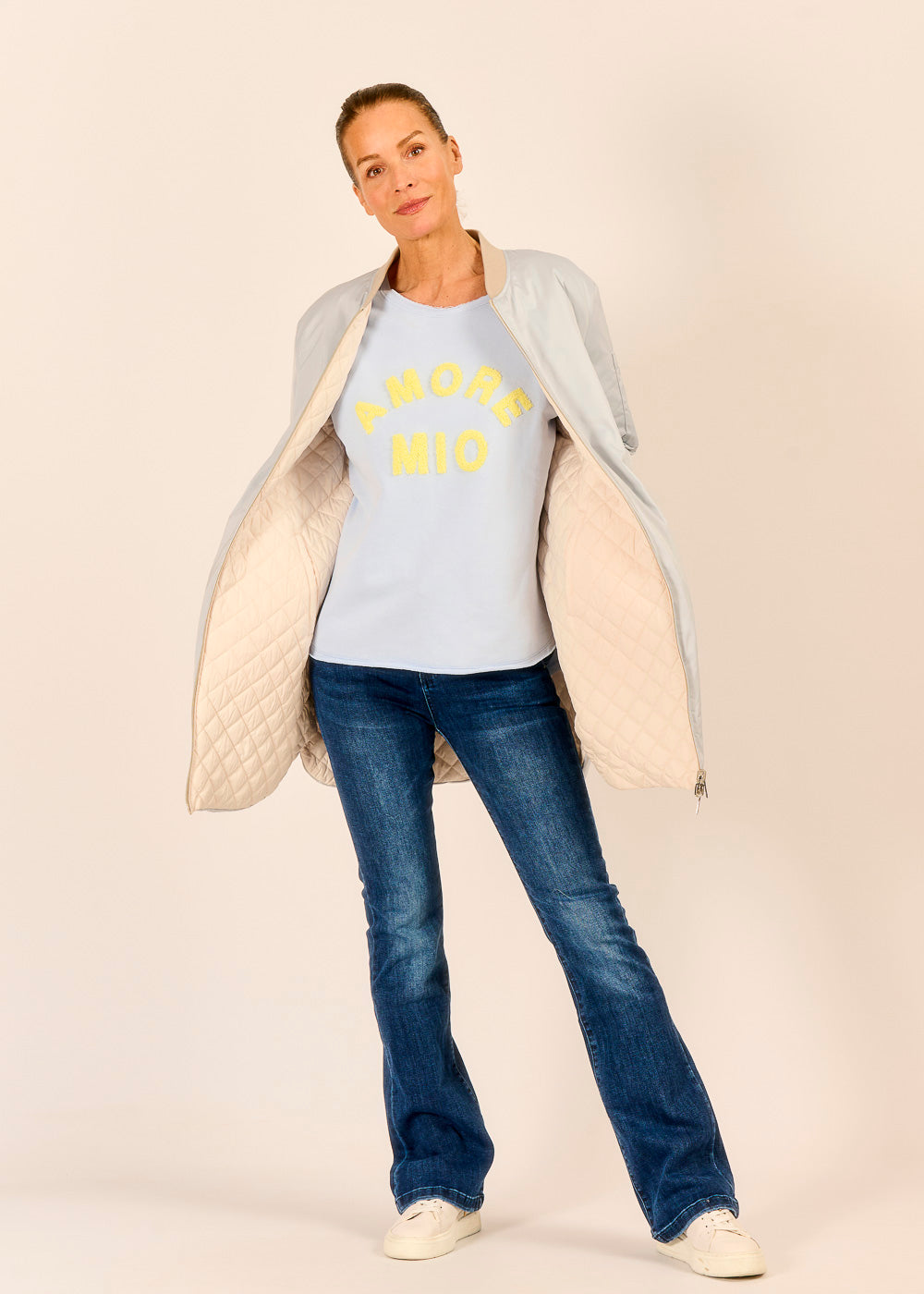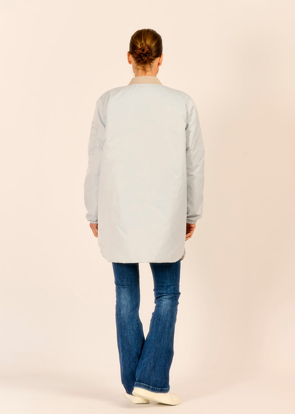 Der vielseitige Wendebomberino sorgt durch den langen Schnitt für maximalen Komfort in der kühlen Übergangszeit. Durch das clevere Wendekonzept hast du zwei Looks in einem: Die hellblaue Seite wirkt ruhig und elegant, während die gesteppte Seite deinem Look einen edlen Akzent verleiht.