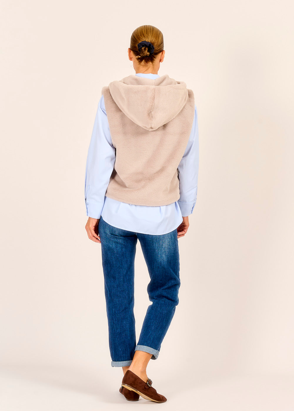Grigiofarbenes Kunstfell umhüllt Sie wie eine sanfte Wolke aus Luxus und sorgt für einen Hauch zeitloser Eleganz. Die Kapuze verleiht dem Look eine moderne, lässige Note, während die klare Silhouette die perfekte Alternative zum klassischen Blazer bietet. Ob drinnen beim Meeting oder draußen beim Stadtbummel – diese Weste macht jedes Outfit sofort besonders. Ein Statement-Piece voller Stil, Komfort und selbstbewusster Raffinesse, das Sie nicht mehr missen möchten.