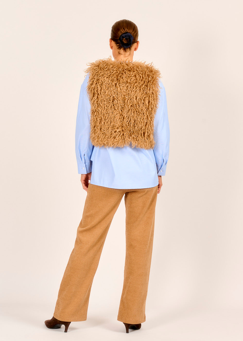 Bringe einen Hauch von luxuriösem Boho-Chic in deinen Kleiderschrank mit dieser Fake Fur Weste in warmem Caramello. Das lange, zottelige Kunstfell verleiht deinem Look eine aufregende Textur und hält dich kuschelig warm. Sie ist das perfekte Statement-Piece, um jedes schlichte Oberteil, wie etwa eine klassische Bluse, sofort aufzuwerten. Mit dieser Weste verleihst du deinem Outfit im Handumdrehen einen coolen und entspannten Vibe.