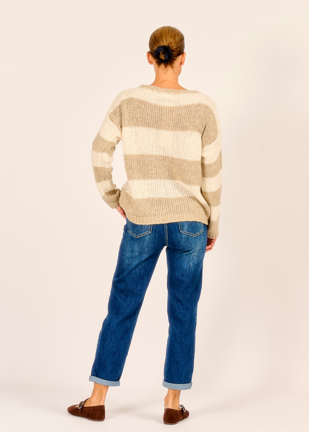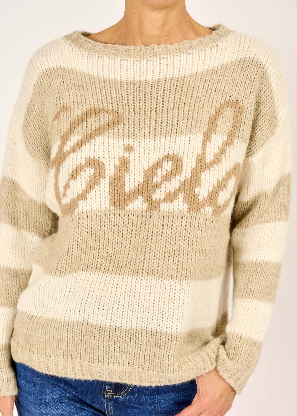 Dieser grobgestrickte Pullover vereint lässigen Komfort mit markanter Optik – breite Streifen und das große Wort „Cielo“ auf der Brust ziehen alle Blicke auf sich. So weich und gemütlich wie ein Spaziergang unter offenem Himmel, schenkt er Ihnen ein Wohlgefühl bei jedem Tragen. Was könnte schöner sein, als den Himmel immer ganz nah bei sich zu tragen?