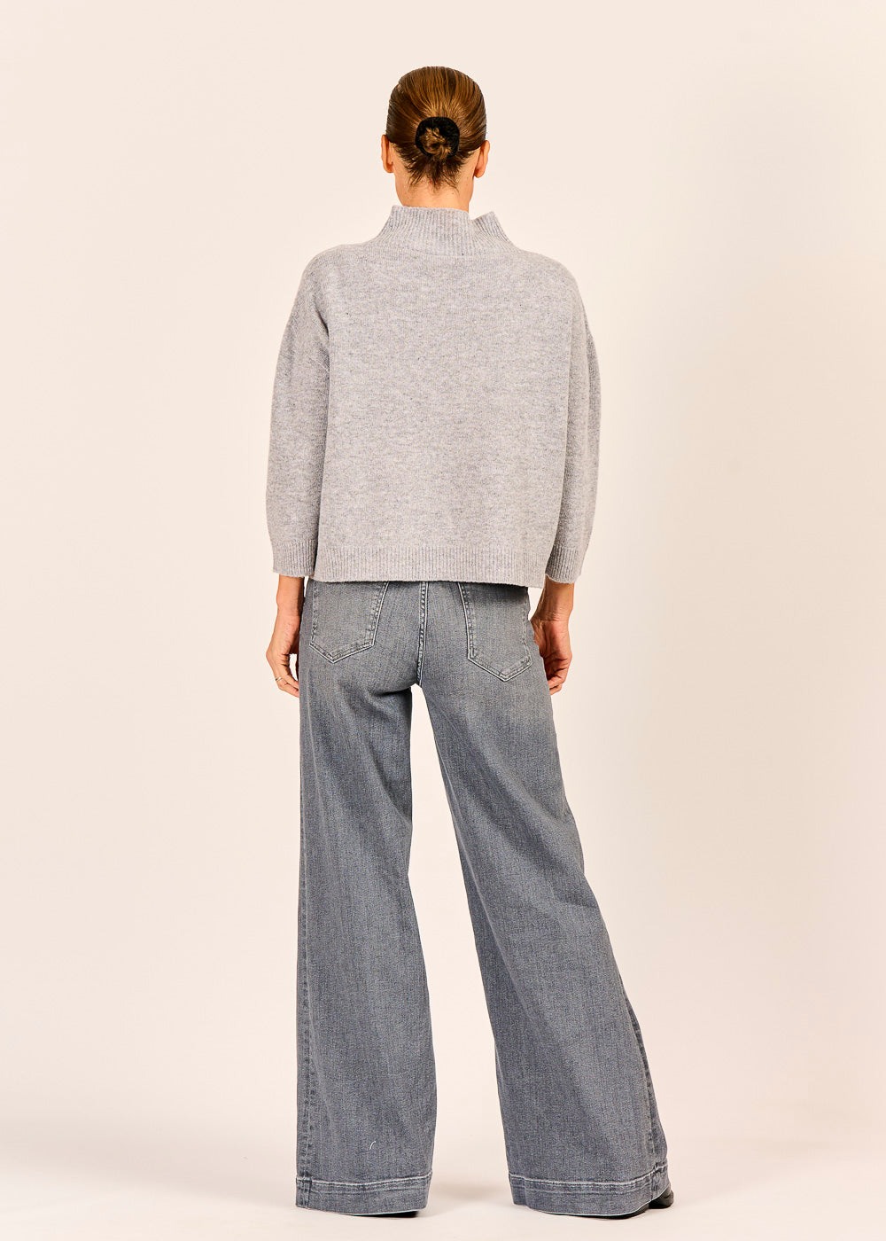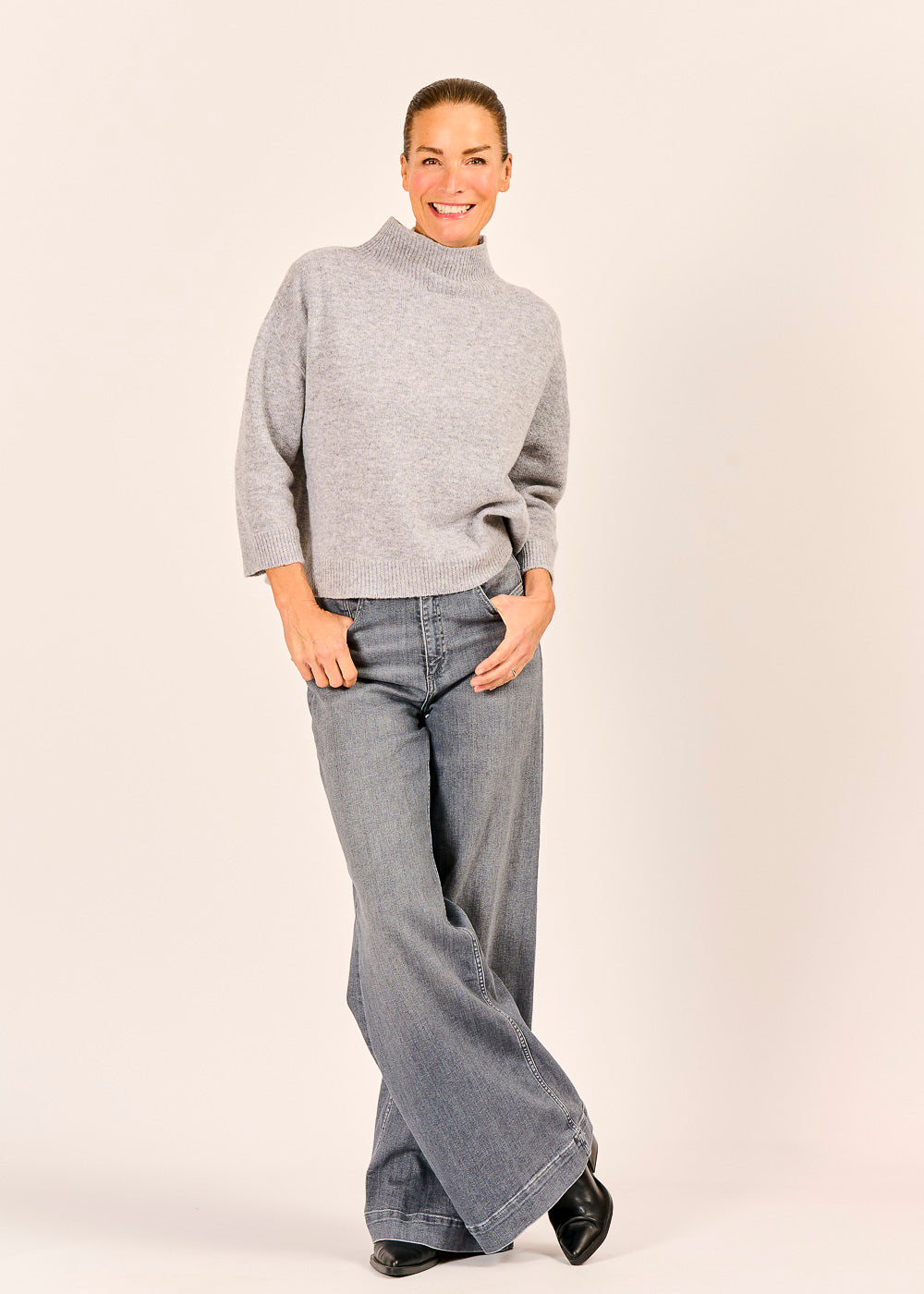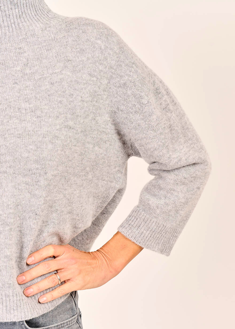 Dieser Pullover in elegantem Grigio (Grau) ist ein Zeichen für hochwertige Strickkunst und zeitlosen Minimalismus. Das luxuriös weiche Material und der cleane Stehkragen bieten höchsten Tragekomfort und eine anspruchsvolle Ästhetik. Der moderne 3/4-Arm und der leicht kastige Schnitt machen ihn zum perfekten Basic, das Sie mühelos casual zur Jeans oder elegant zu Stoffhosen stylen können.