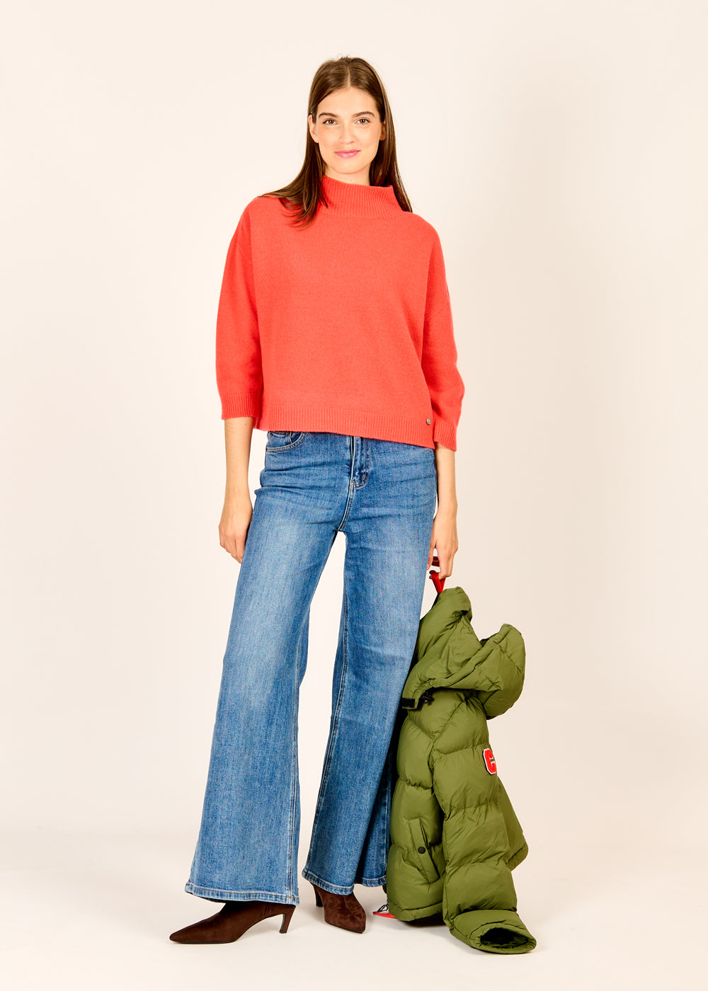 Unser 3/4-Arm Pullover in strahlendem Corallo ist die perfekte Wahl für einen modischen Auftritt. Der Pullover ist aus superweicher Wolle gefertigt, die für ein unvergleichlich angenehmes Tragegefühl sorgt. Mit dem lässigen Schnitt und der lebendigen Farbe verleiht er jedem Outfit eine frische und moderne Note.