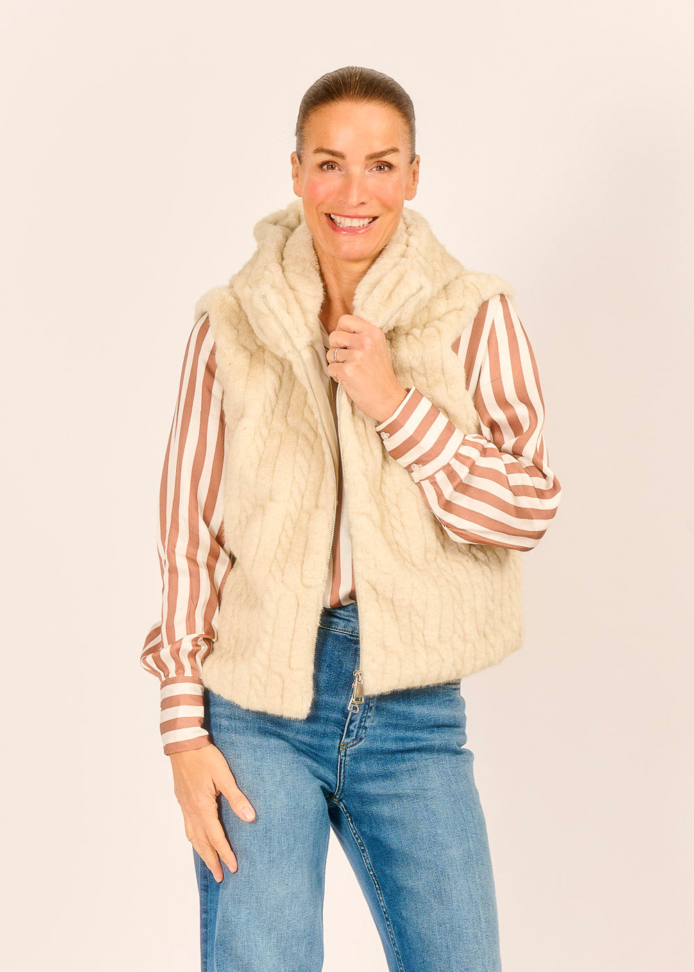 Diese edle Weste in luxuriöser Fake Fur Qualität besticht durch ihr raffiniertes, in den Stoff eingearbeitetes Zopfmuster, das ihr eine einzigartige Textur und Tiefe verleiht. Sie präsentiert sich als sehr edles und stylisches Statement-Piece, das mühelos schlichte Looks aufwertet und sofort eine glamouröse Note hinzufügt. Tragen Sie diese Weste als elegante Schicht über Blusen oder Feinstrick und genießen Sie ein kuscheliges Tragegefühl, ohne auf modischen Chic verzichten zu müssen.