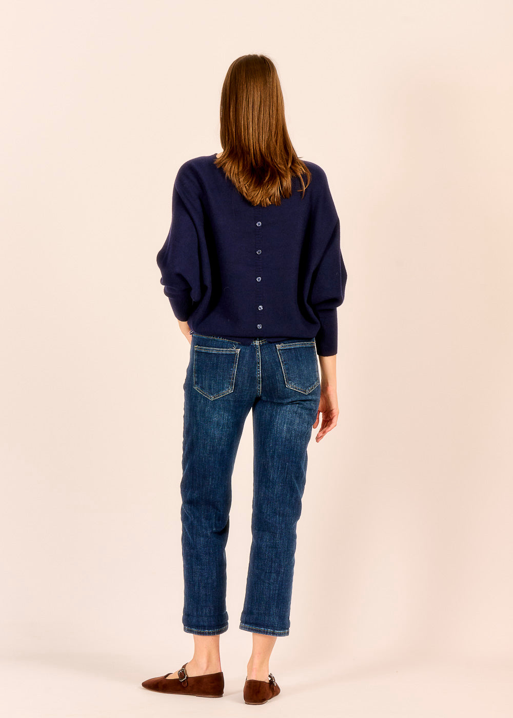 Die Knopfleiste am Rücken verleiht dem Pullover mit weiten Ärmeln in edlem Dunkelblau einen überraschenden Akzent. Weiche Viskose sorgt für ein sanftes, angenehmes Tragegefühl. Ein vielseitiges Lieblingsstück für alle, die besondere Details lieben.