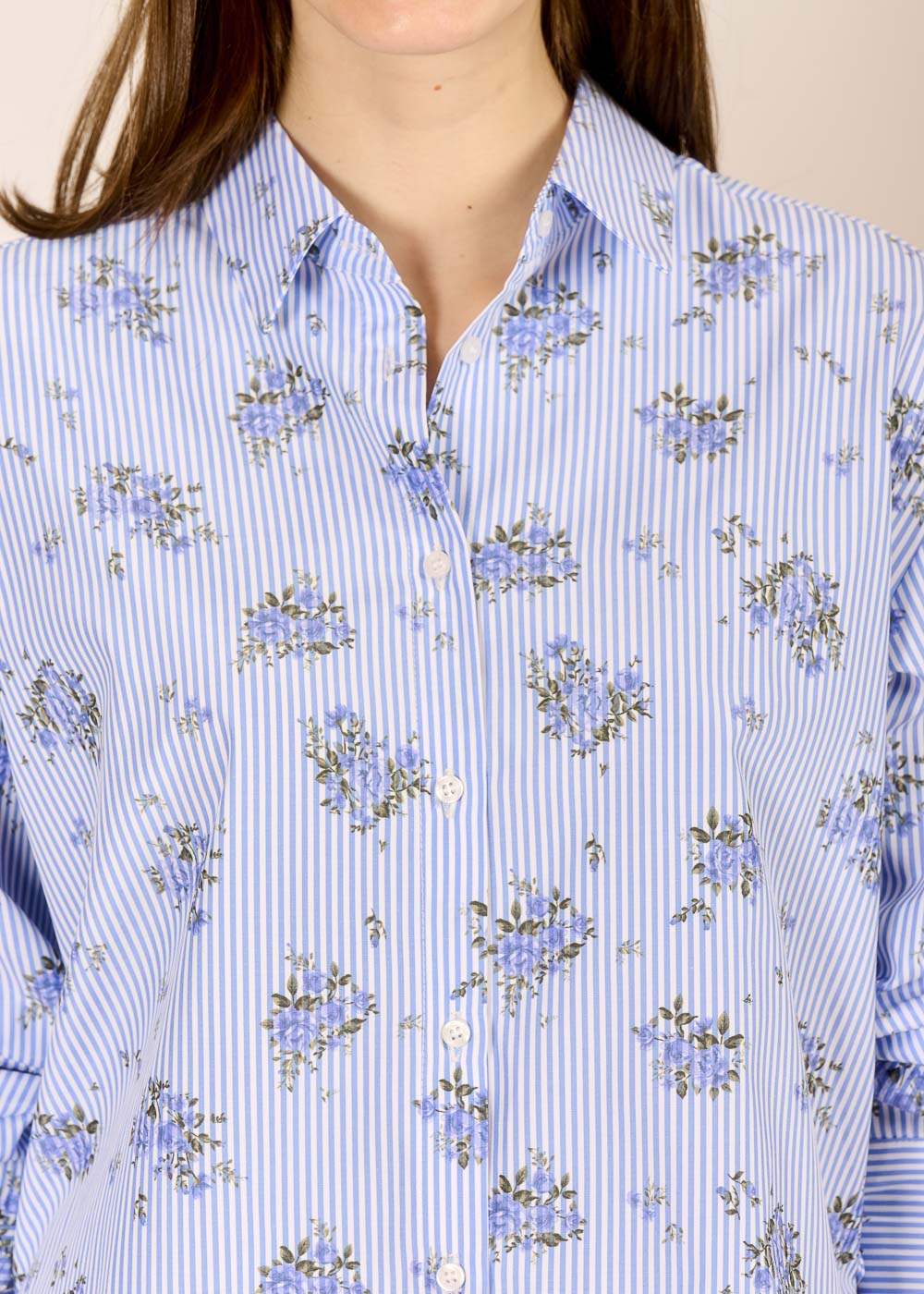 Diese Streifenbluse mit Blumenmuster vereint zeitloses Design, romantische Leichtigkeit und italienische Raffinesse, dank der Schlitze an den Seiten. Ob lässig in die dunkelblaue Hose gesteckt oder unter dem passenden Bomberino gestylt – diese Bluse ist ein echtes Lieblingsstück.